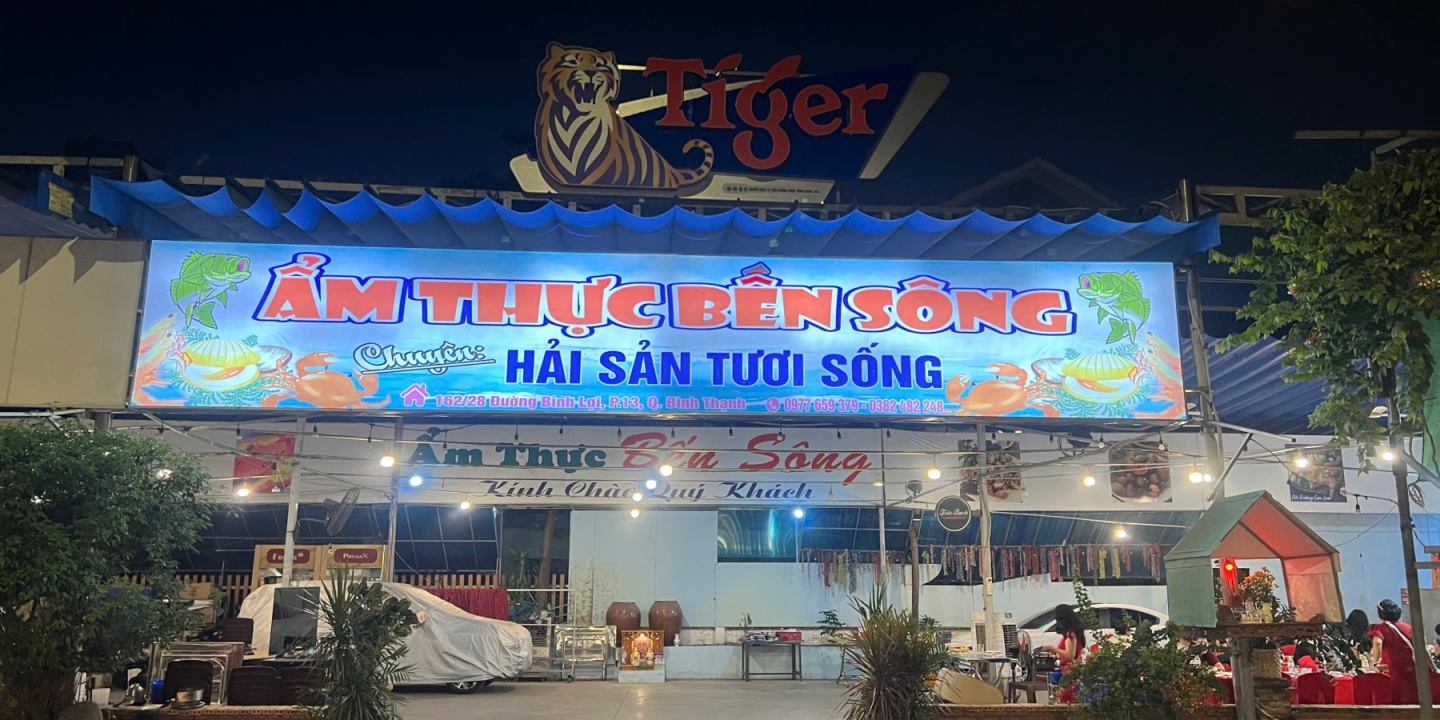 Nhà hàng Bến Sông (162/28 Bình Lợi) – Quán nhậu view đẹp ở TP.HCM với không gian ven sông "đẹp như phim". Điểm hẹn lý tưởng cho giới trẻ và gia đình thưởng thức ẩm thực Bến Sông đặc sắc (Hải sản, Bò, Bồ câu) và đặt tiệc tất niên, sinh nhật chuyên nghiệp. Bến Sông Riverside – Cinematic city views & premium riverside dining. The ultimate spot for trendy hangouts, family gatherings, and professional events.